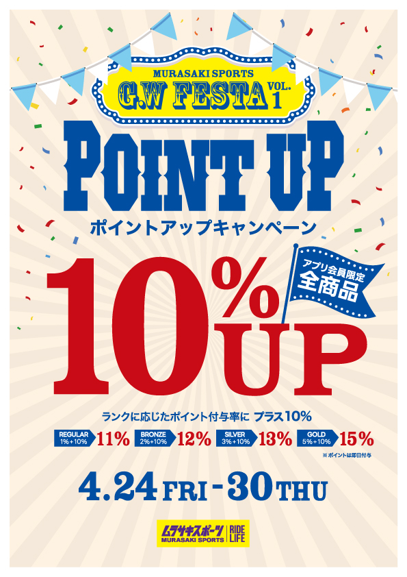🎉GWフェスタ開催!ポイント10%アップキャンペーン【ムラサキスポーツ】