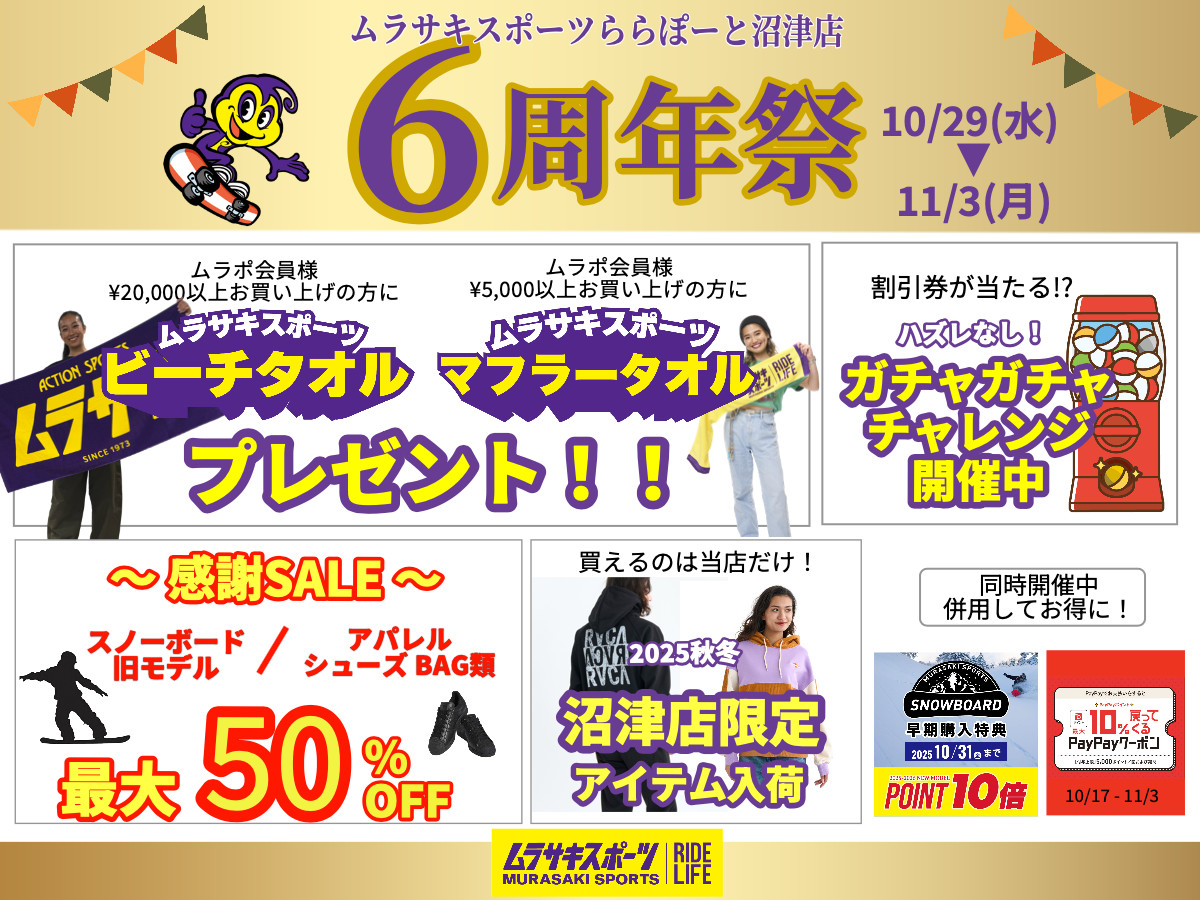 【ムラサキスポーツららぽーと沼津店6周年祭】10/29(水)〜11/3(月•祝)