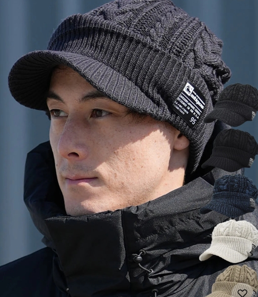 大きめなデザインですっぽりかぶれるケーブル編みにリブ編みを織り交ぜたつば付きニット帽
